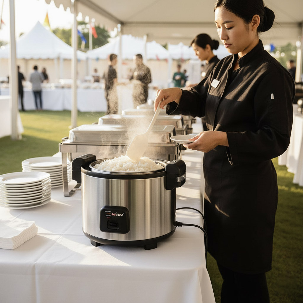 Induction and electric cookers and warmers are versatile for buffet service and small-batch cooking. They provide precise, adjustable heat without open flames, making them safer for crowded indoor or outdoor setups. Induction units heat cookware directly, which speeds up cooking and reduces wasted energy.