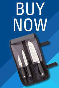 The Mercer knife starter set includes a 7" Santoku knife, 5" utility knife, and 3-1/2" paring knife, along with a heavy-duty storage roll.