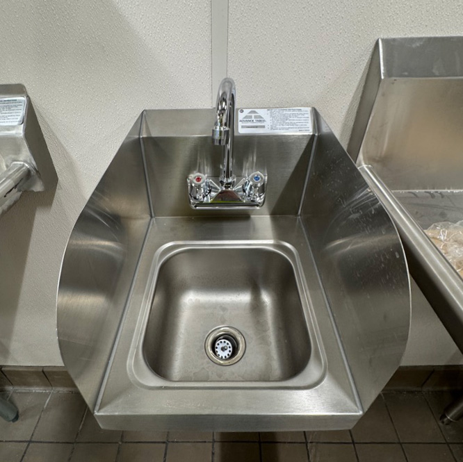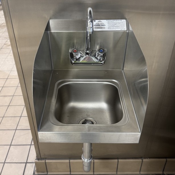 - Advance Tabco Hand Sink – Heavy-gauge 304 stainless steel construction with a 9" x 9" x 5" bowl and 7-3/4" welded side splashes. Comes with a lead-free splash mount faucet, basket drain, and galvanized wall mounting bracket. NSF certified.