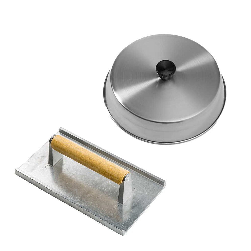These tools enhance performance on the griddle by helping retain heat and apply pressure where needed. Use basting covers to melt cheese, steam vegetables, or speed up cook times. Steak weights help flatten bacon, press sandwiches evenly, and ensure consistent searing. Together, they’re essential for fast, even, flavorful results.
