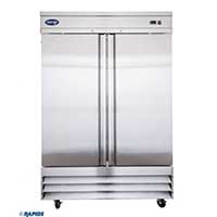The Volition VF49-S solid two door reach-in commercial freezer offers easy temperature control, superior maintenance, energy star energy ratings. This 49 Cu.Ft. commercial freezer comes standard with heavy duty, coated shelves, and door hinges, key locks, recessed handles, self adjusting magnetic gaskets and 4 inch castors which make it a breeze for moving during cleaning.